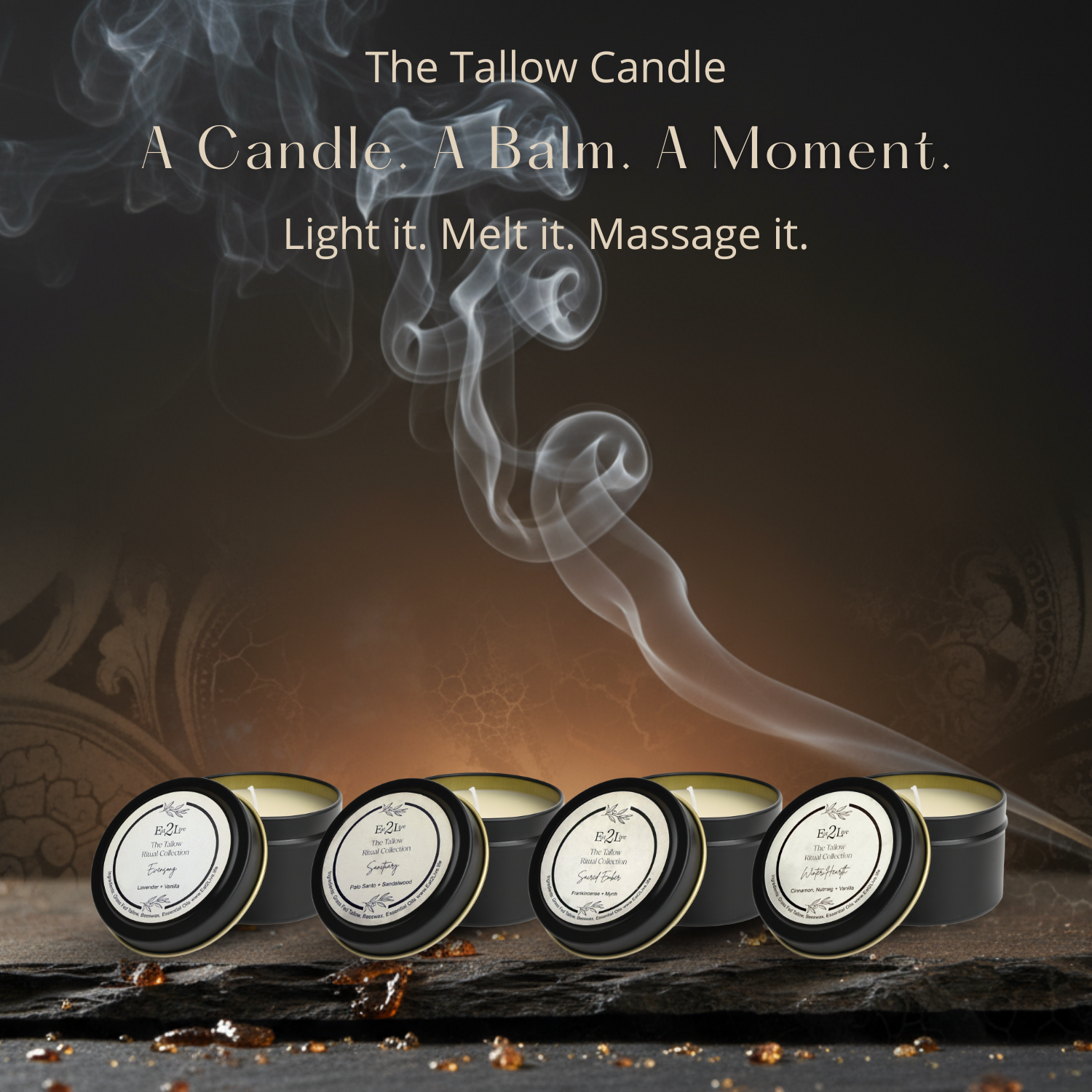 Hand-poured withgrass-fed tallow,pure beeswax, andessential oils, each blend melts into a warm balm for body and soul — free from toxins, perfumes, and synthetics.