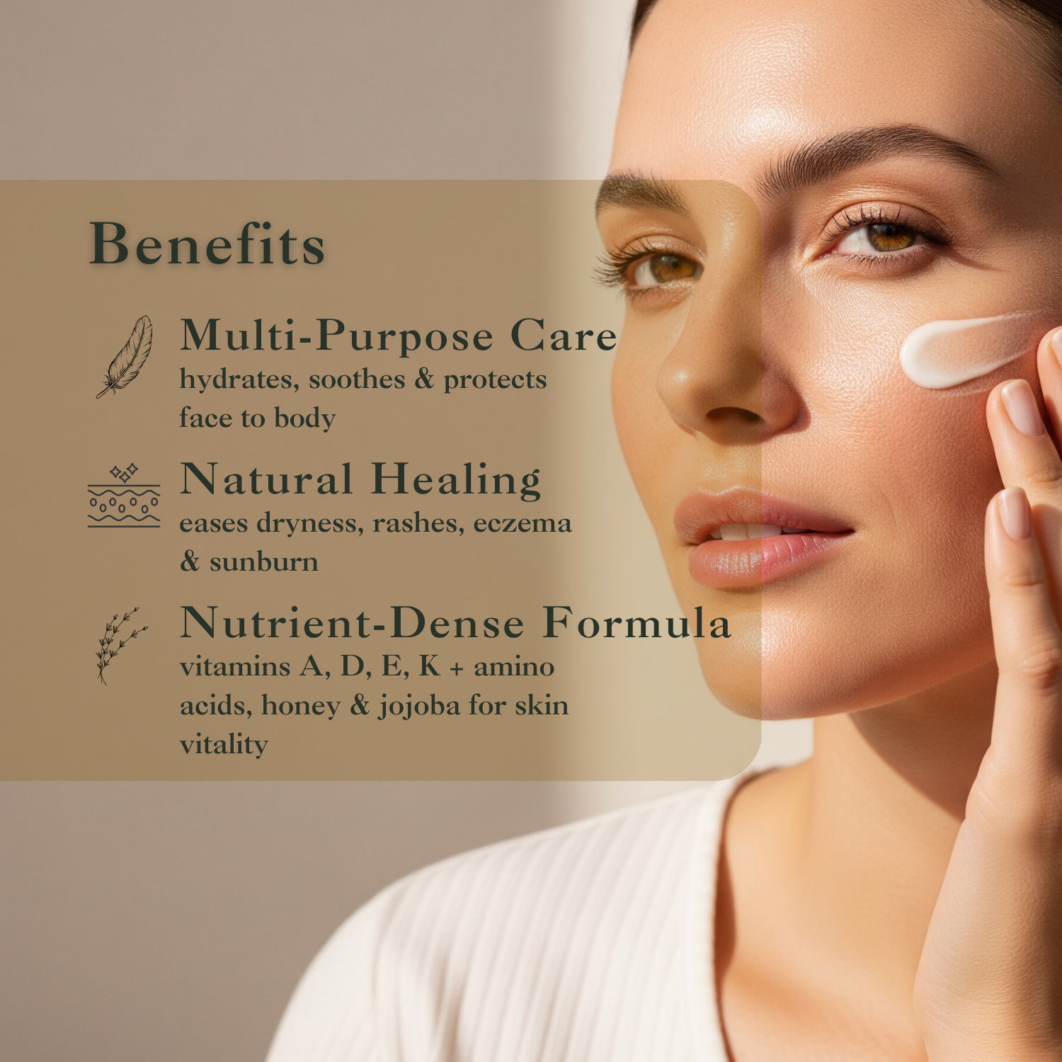 - Nutrient-Dense Formula: Packed with Vitamins A, D, E, K, essential amino acids, raw honey, and jojoba oil for comprehensive nourishment and skin protection.