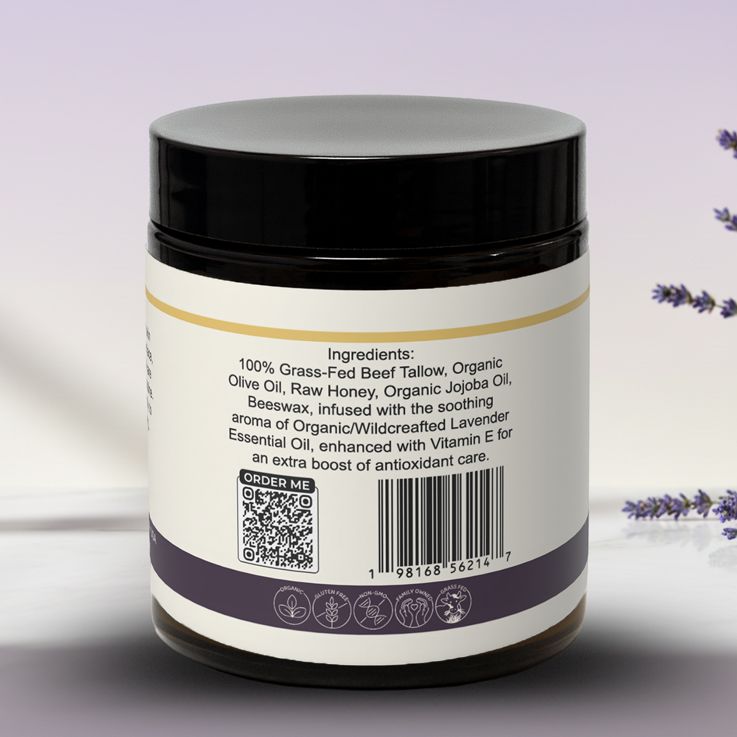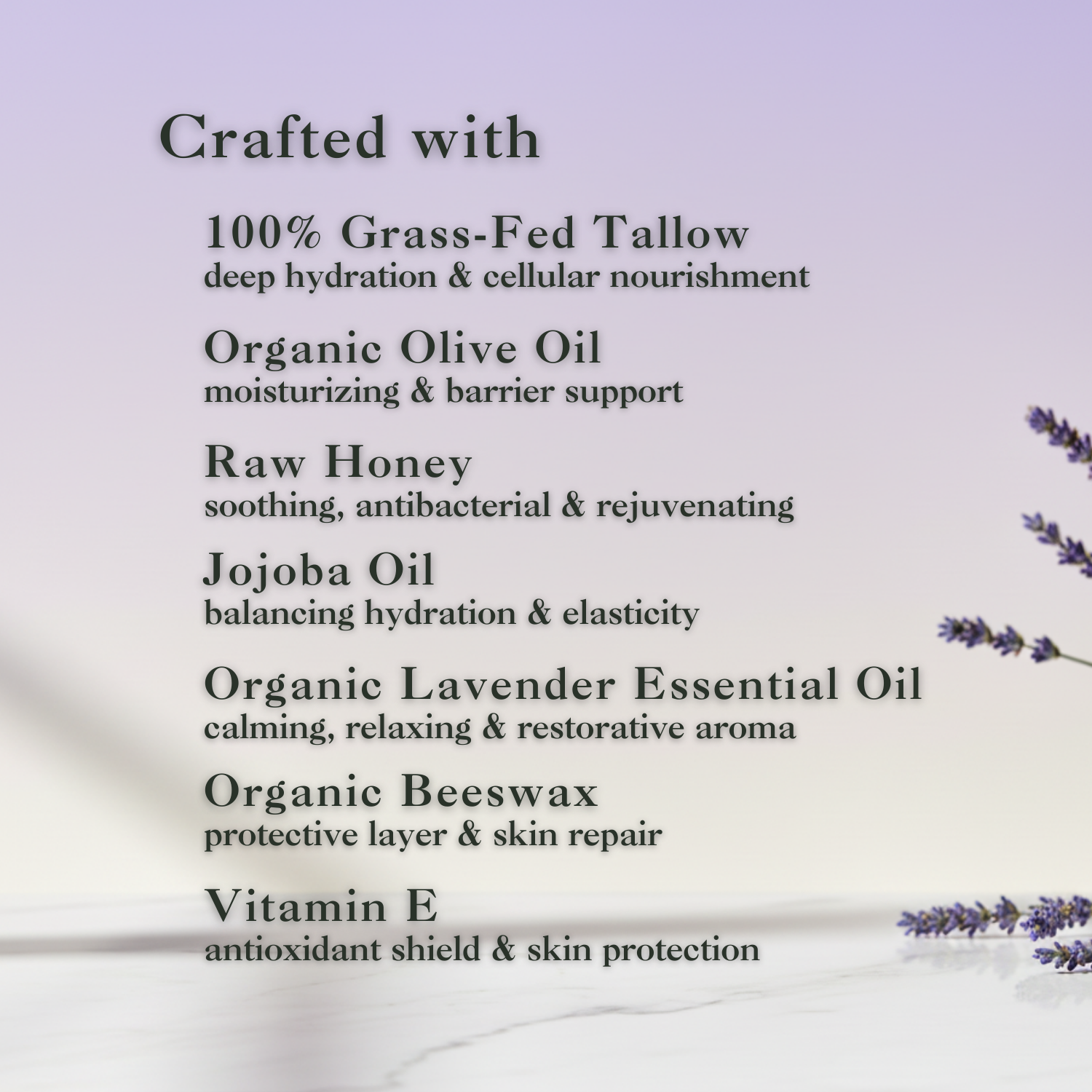 Formulated with 100% grass-fed beef tallow, organic olive oil, organic beeswax, raw honey, jojoba oil, and infused with the soothing aroma of organic lavender essential oil, enhanced with vitamin E for added skin protection.